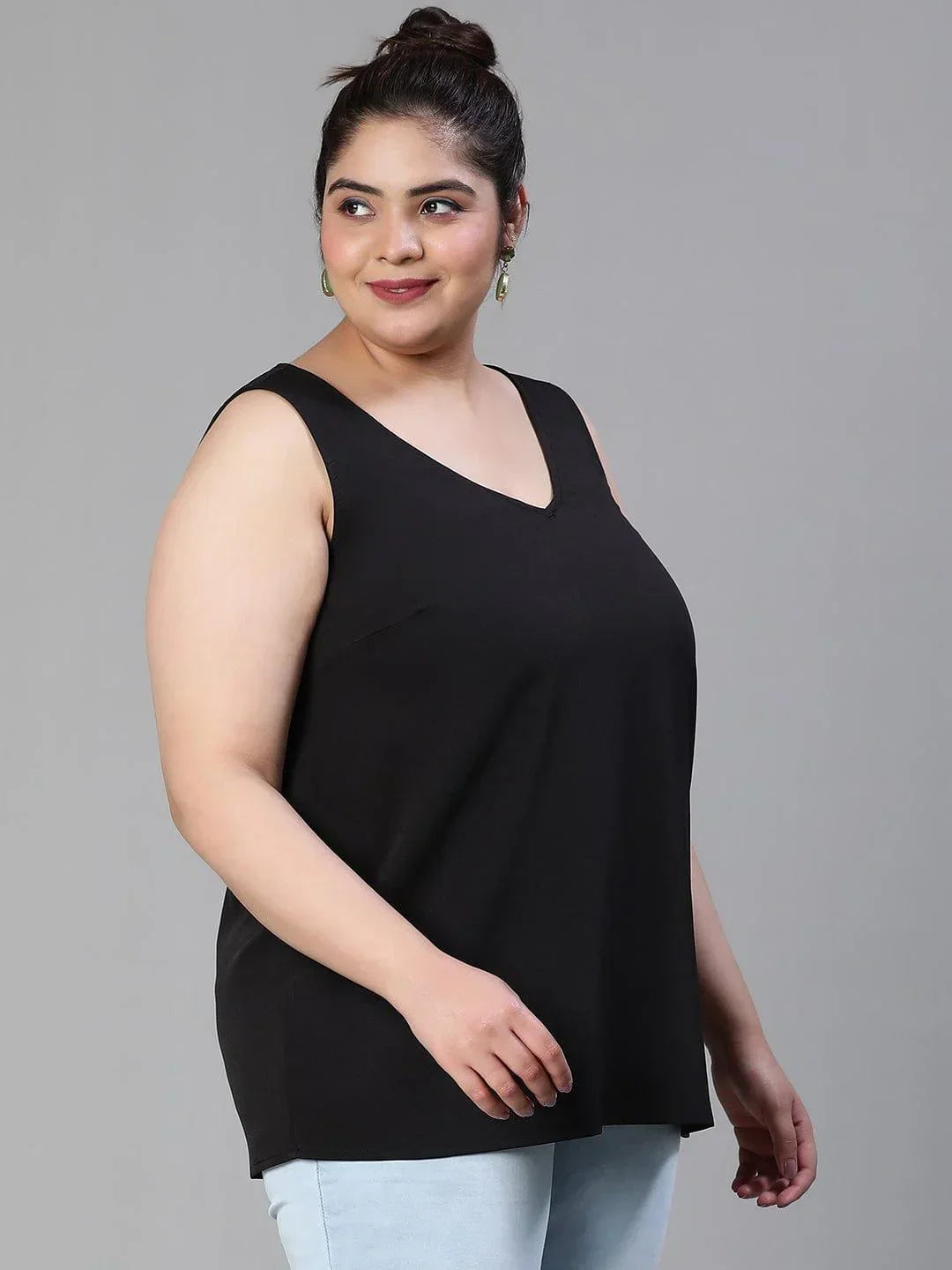 Walk into the summer style like a queen wearing this fabulous Enhanced solid black sleeveless plus size women top that is super trendy, fashionable, and a classic pick for office time, to party. Designed with polyester fabric, this sleeveless top has a round neck, circular hem, and length to the hips. Pair it with nice-looking blue denim or black pants to get the complete right look to wear & flaunt, and make your curves groove this season.