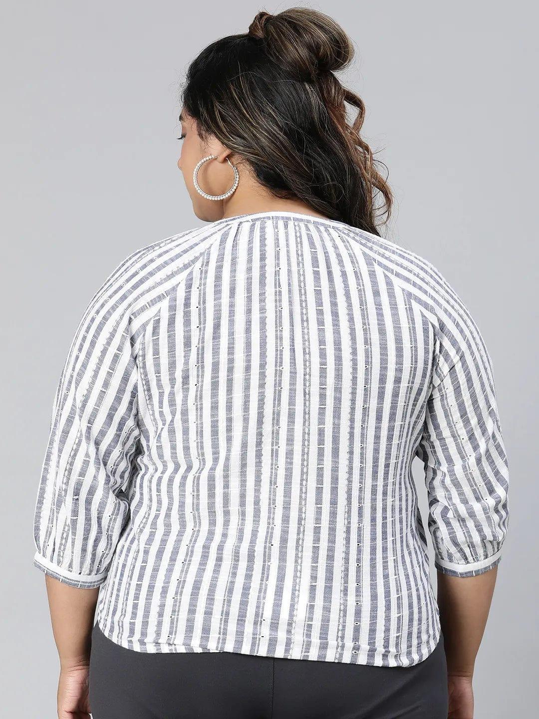 Get the right fashion with our Iconic Blue Stripe Print Plus Size Cotton Top, a perfect blend of elegance and ease. This versatile piece effortlessly takes you from office chic to casual cool to party-ready. With its superb fit and fabulous look, it’s a wardrobe essential.