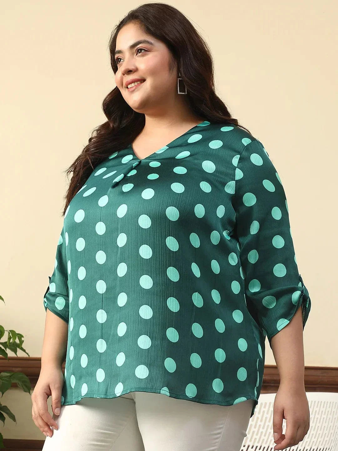 Add a touch of playful elegance to your wardrobe with this Creative Green Satin Chiffon Polka Dot Print Plus Size Top With Long Sleeves And Pleated Detailing. Designed for plus-size women, it features a flattering V-neckline, pleated detailing, and stylish roll-up long sleeves. Made from lightweight polyester, this top is both breathable and chic—perfect for work or a weekend outing.