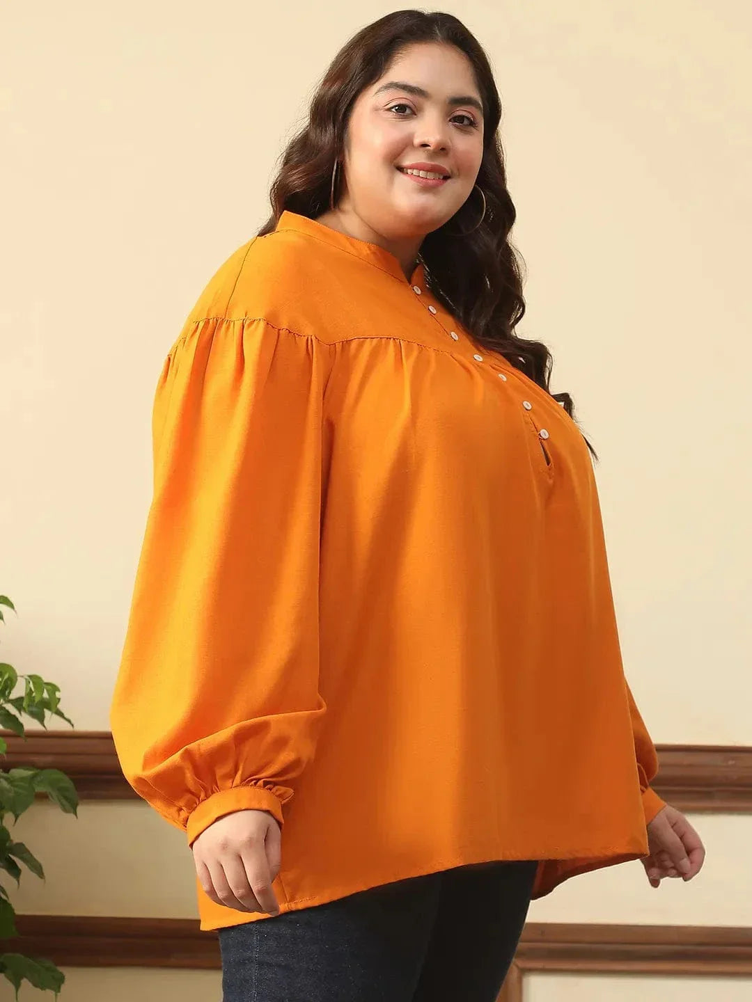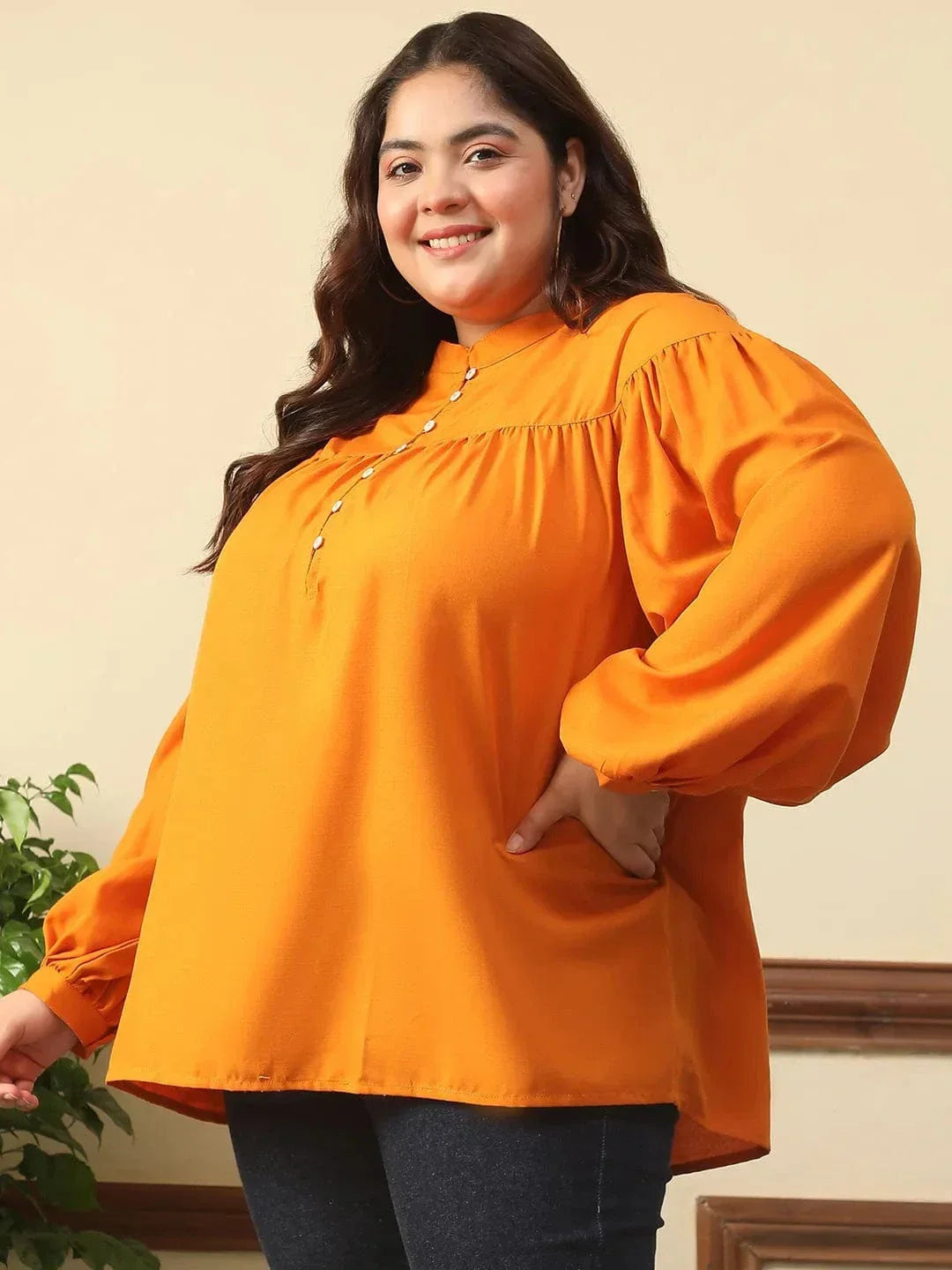 Pop Of Color And All-Day Comfort, This Summer Orange Round Neck With Button Placket Long Lantern Sleeve Plus Size Women Top, Specially Crafted For Plus-Size Beauties Who Love A Blend Of Simplicity And Statement. Made With Soft, Breathable Viscose Spun Fabric, It Offers A Relaxed Fit With A Smooth Finish That Keeps You Comfortable All Day Long. The Classic Round Neckline Paired With A Subtle Button Placket Detail Adds A Dash Of Charm, While The Long Lantern Sleeves Make It Perfect For Year-Round Wear. Whether you're heading To Work Or Weekend Brunch, This Top Adds The Right Touch Of Brightness To Any Outfit.