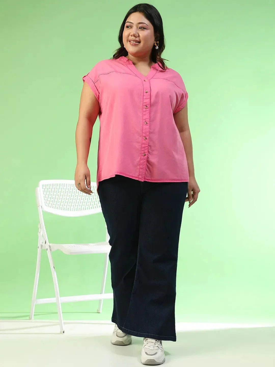 Perfect for work, brunch, or a day out, this Spellbound Pink Short Sleeve Button Down Plus Size Women Cotton Top proves that chic, curve-friendly fashion can be both comfortable and versatile. Designed to flatter curves and keep you feeling confident all day long. The soft pink hue brings a feminine, refreshing touch, while the V-neckline enhances and elongates your neckline, creating a flattering silhouette for plus-size women. Thoughtfully designed with short sleeves that roll up and secure with button tabs, this top lets you switch between polished and relaxed looks with ease. The button-down front adds versatility, making it easy to wear tucked in, layered, or left open for a casual vibe. Crafted in lightweight, breathable cotton, it drapes gently without clinging, ensuring maximum comfort while keeping the style effortless.