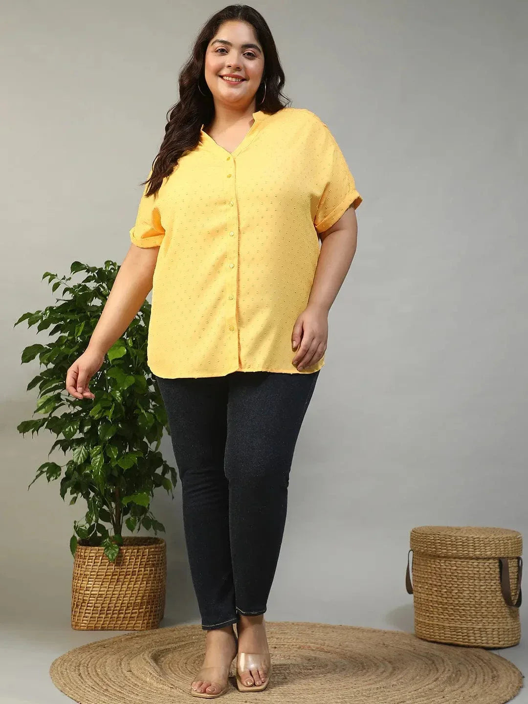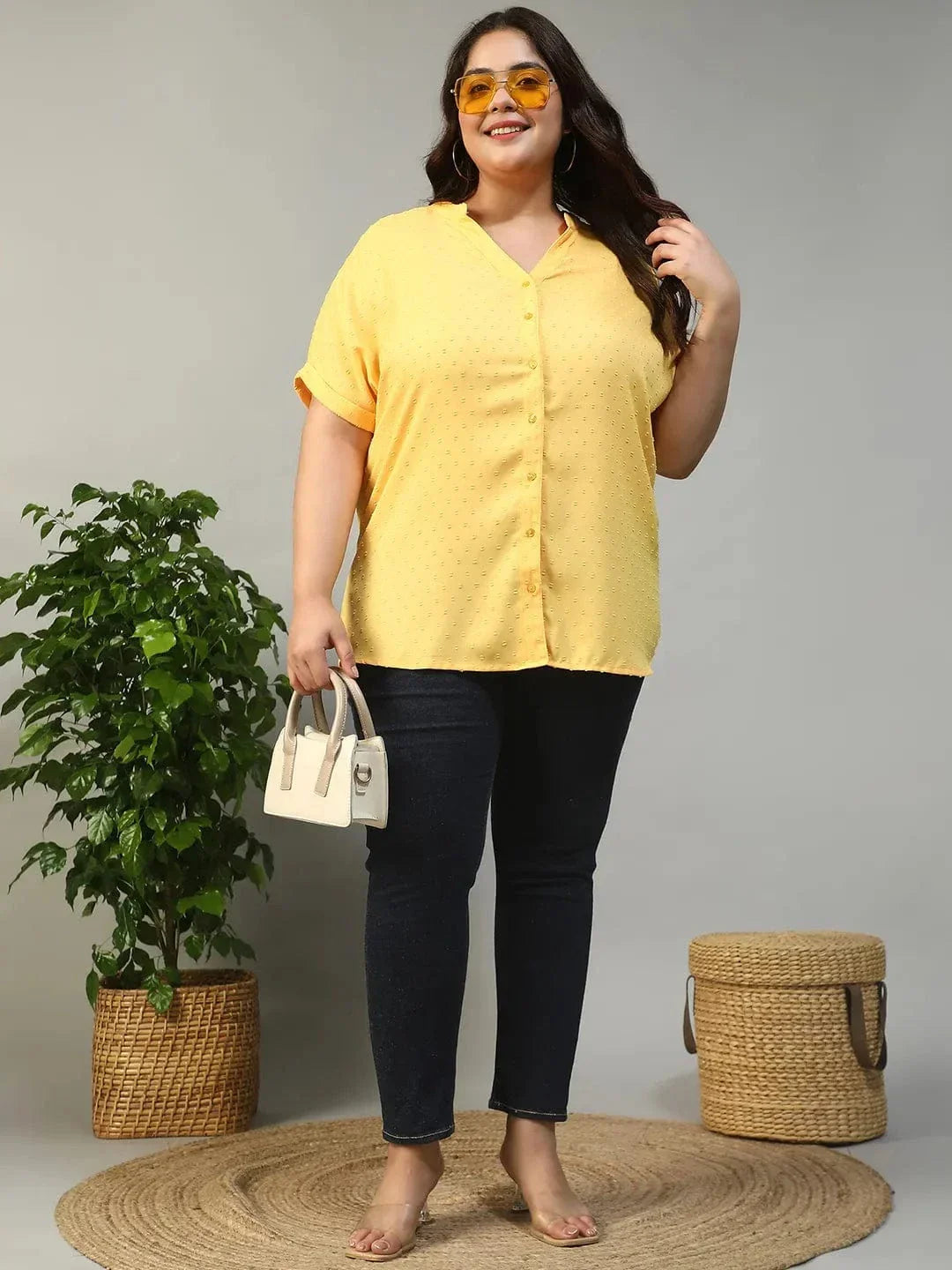 Brighten Your Wardrobe With Sunshine Tones And Breezy Charm With Our Charming Yellow Short Sleeve Button Down Boota Dobby Printed Plus Size Women Top. Crafted From Soft, Breathable Polyester Dobby Fabric, This Top Is Adorned With A Delicate Boota-Inspired Print That Adds Ethnic Elegance To Your Everyday Look. The Flattering V-Neckline, Short Sleeves, And Button-Down Front Create A Relaxed Yet Structured Silhouette — Perfect For Plus-Size Figures. Lightweight And Full Of Flair, This Top Is Ideal For Sunny Days, Casual Outings, Or Festive Layering.