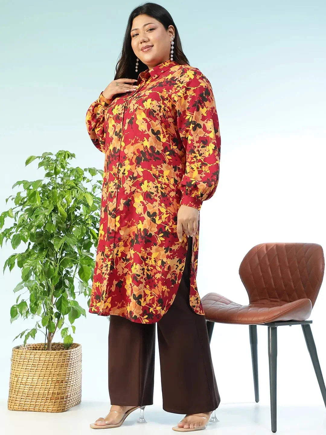 Colorful. Breezy. Beautiful, Say Hello To Effortless Style Multicolor Floral Rayon Print Collared Button -Down Long Sleeve Plus Size Women Tunic, Crafted In Soft, Breathable Viscose For All-Day Comfort. The Vibrant Floral Print Adds A Splash Of Joy, While The Classic Collar And Button-Down Front Bring In A Polished Touch. With Long Sleeves And A Relaxed Silhouette, This Tunic Offers The Perfect Balance Of Comfort And Charm. Whether You're Dressing For Work, Brunch, Or A Casual this tunic Is A Wardrobe Win For Every Season.