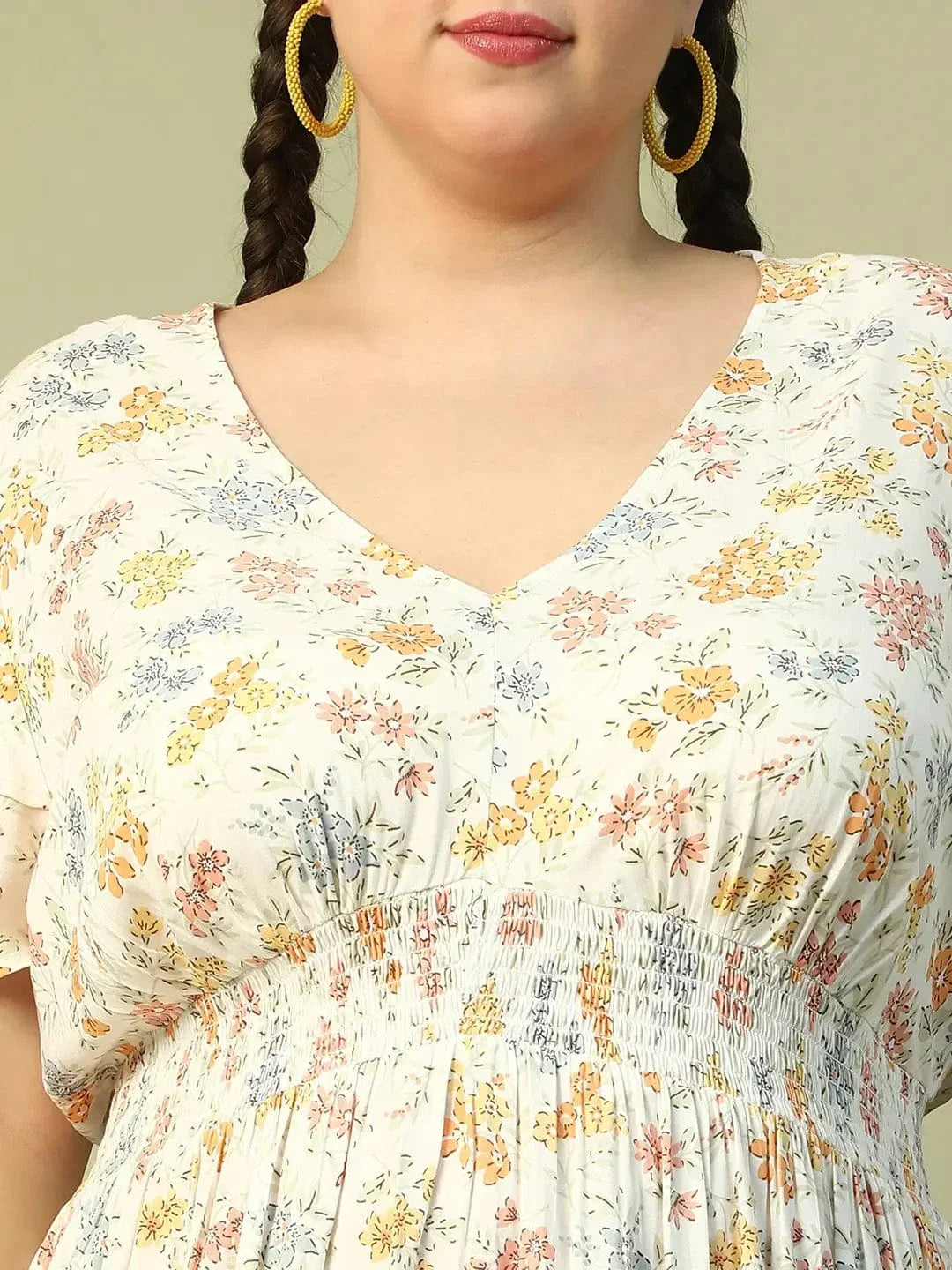 Shine, slay, and look cute and stylish in the Exquisite White Floral Print Short Sleeve Elasticated Plus Size Women Dress. Made from soft, breathable viscose, this dress features a beautiful floral print that adds a fresh, feminine touch. The flattering V-neckline and short sleeves provide comfort, while the elasticated waist creates a defined, comfortable fit. The knee-length design makes it versatile for any occasion, combining style and ease for a chic, effortless look. Perfect for day outings or casual gatherings, this dress is a wardrobe must-have.