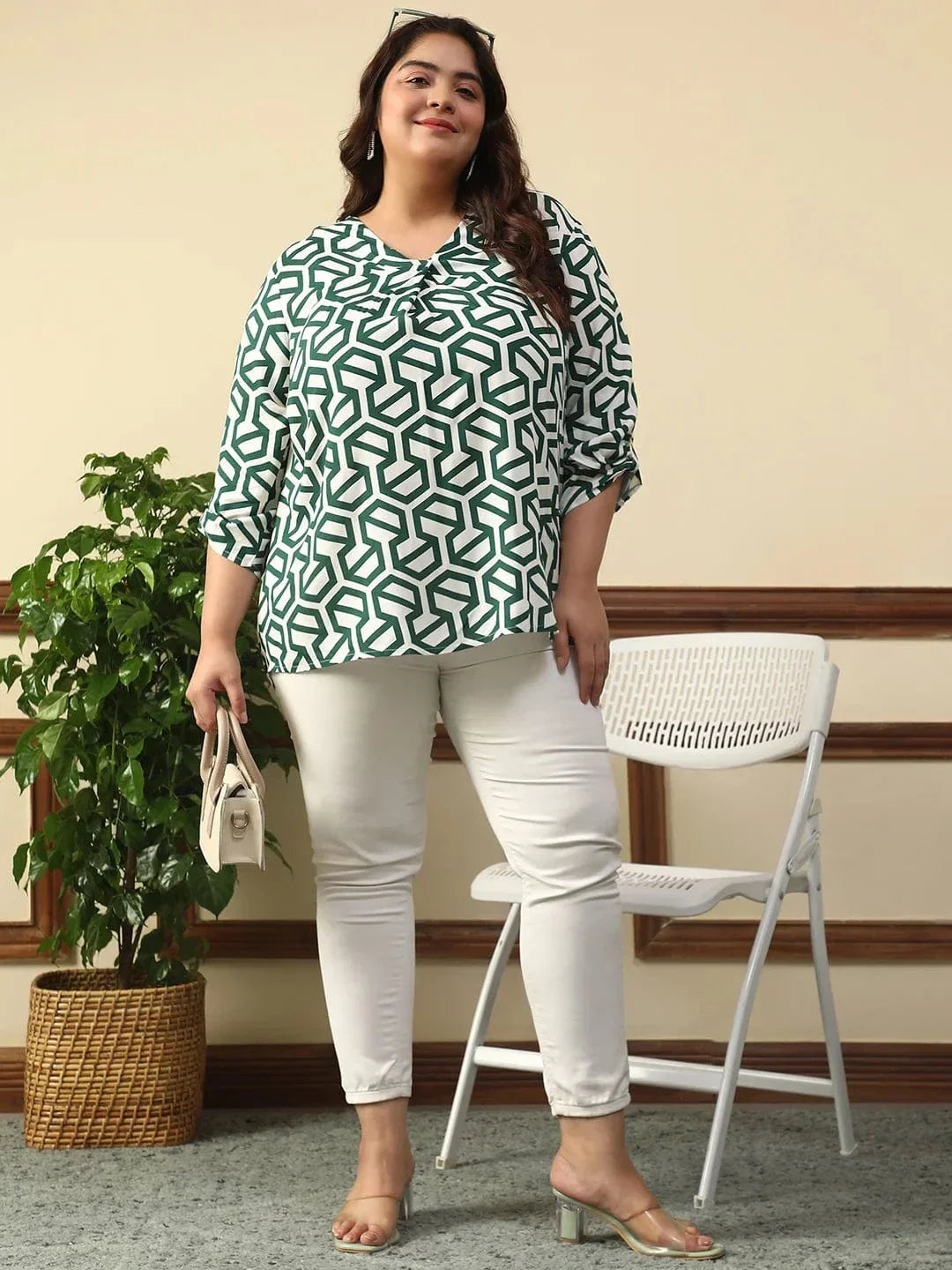Step out in effortless style with this Poise Green Abstract Rayon Print Plus Size Top With Long Sleeves And Pleated Detailing, crafted from soft and breathable viscose fabric. Designed for plus-size comfort, it features a flattering V-neckline, roll-up long sleeves, and pleated detailing that adds a touch of elegance. Perfect for both casual and semi-formal settings, this top is a versatile staple for your wardrobe.