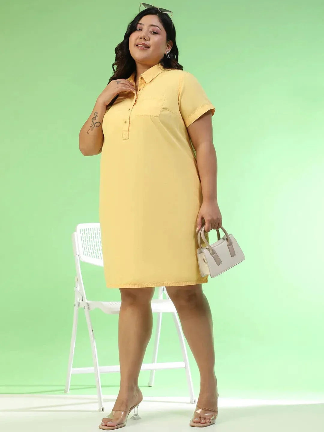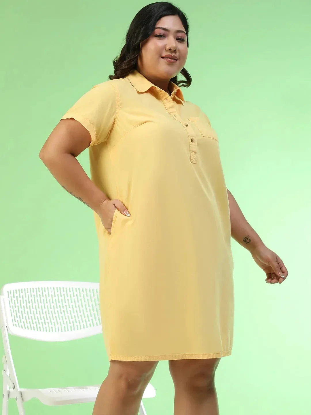 Say hello to comfort dressing with a punch of bold style. This Women Plus Size Solid Yellow Collared Cotton Dress is sunshine in outfit form. The vibrant yellow shade instantly uplifts your look, while the collared neckline with button detail gives it a smart, polished touch. Designed in a comfortable knee-length silhouette, it’s easy to wear, easy to style, and perfect for everything from weekday errands to weekend outings. Made with short sleeves to keep things breezy and light, this dress also comes with both side pockets and a chest pocket – practical details that make it as functional as it is stylish. Crafted in lightweight, breathable cotton, it drapes effortlessly over plus-size curves without clinging, offering you all-day comfort with a fresh, chic vibe. Whether casual or slightly dressed up, this dress makes confidence look effortless.