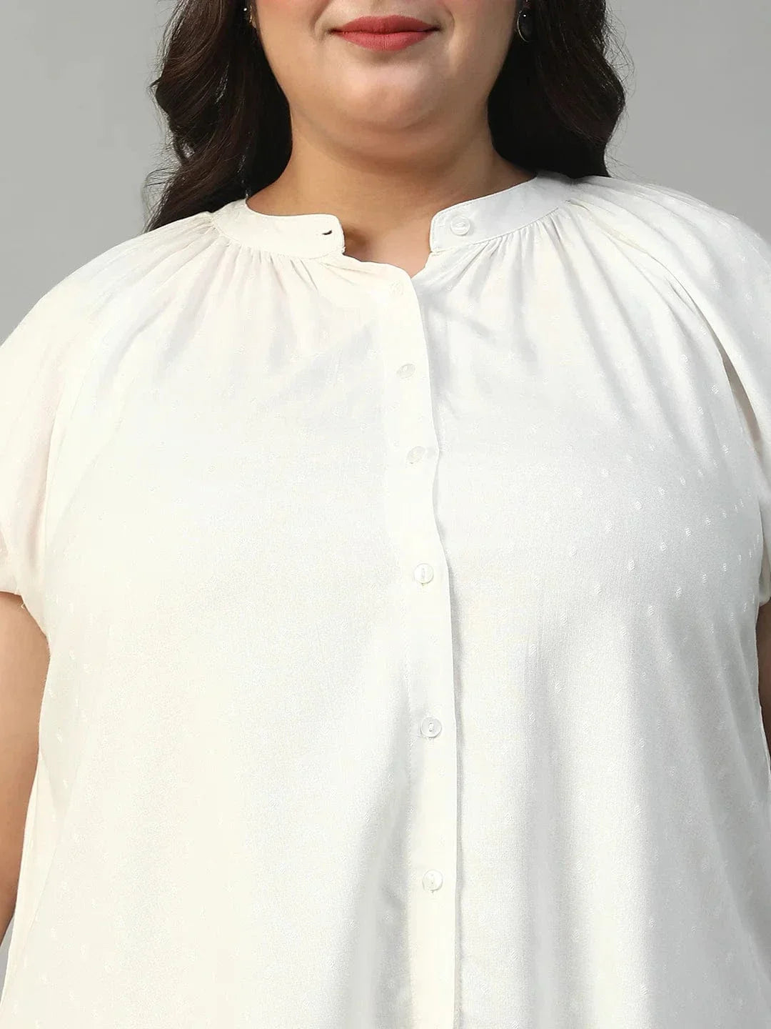 High end your look with this Ravishing White Gather Detail Short Sleeve Button Down Rayon Swiss Dot Dobby Plus Size Women Shirt. Crafted in breezy viscose rayon Swiss dot dobby fabric. The round neckline offers a soft, feminine appeal, while the button-down front provides ease and versatility. Designed with gathered detailing in front, it gracefully skims your curves without clinging, giving a relaxed yet flattering silhouette. The delicate textured dot weave adds a subtle, stylish dimension to the classic white shirt—making it a wardrobe essential that transitions effortlessly from day to night.