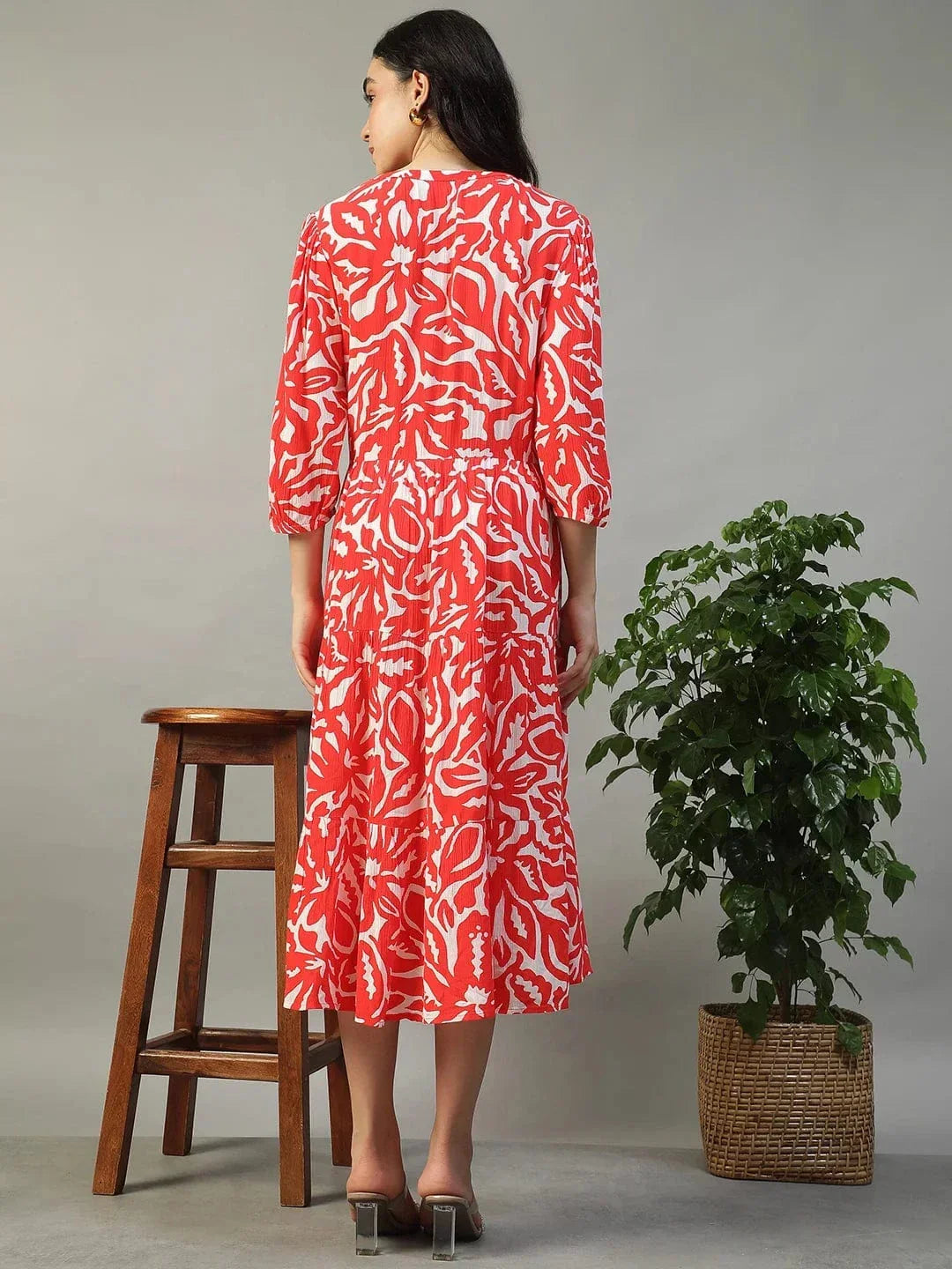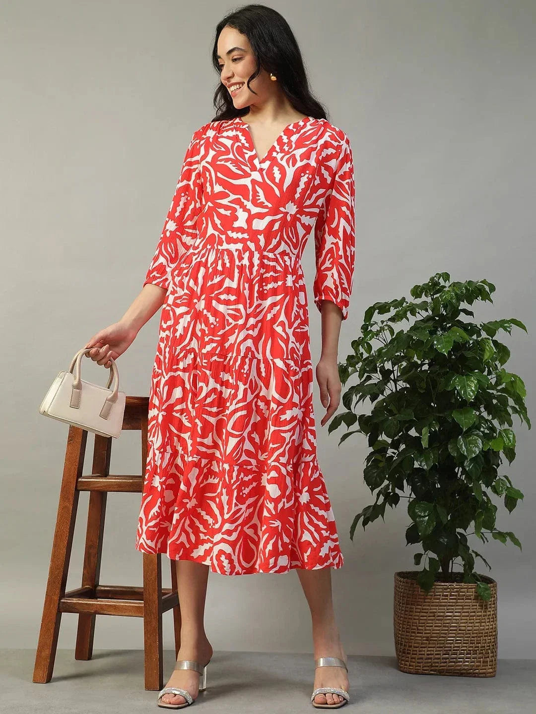 Add a playful fashion to your wardrobe with this Special Red Floral Print 3/4 Length Sleeves Women's Dress, crafted in lightweight, breathable viscose fabric. The fabric's soft texture and finish give it a relaxed drape, while the floral print lends a cheerful, modern touch. This dress features a V-neckline and 3/4 length sleeves for all style and comfort. The flare hem and below-knee length add charm and elegance, making it perfect for dressed-up looks.