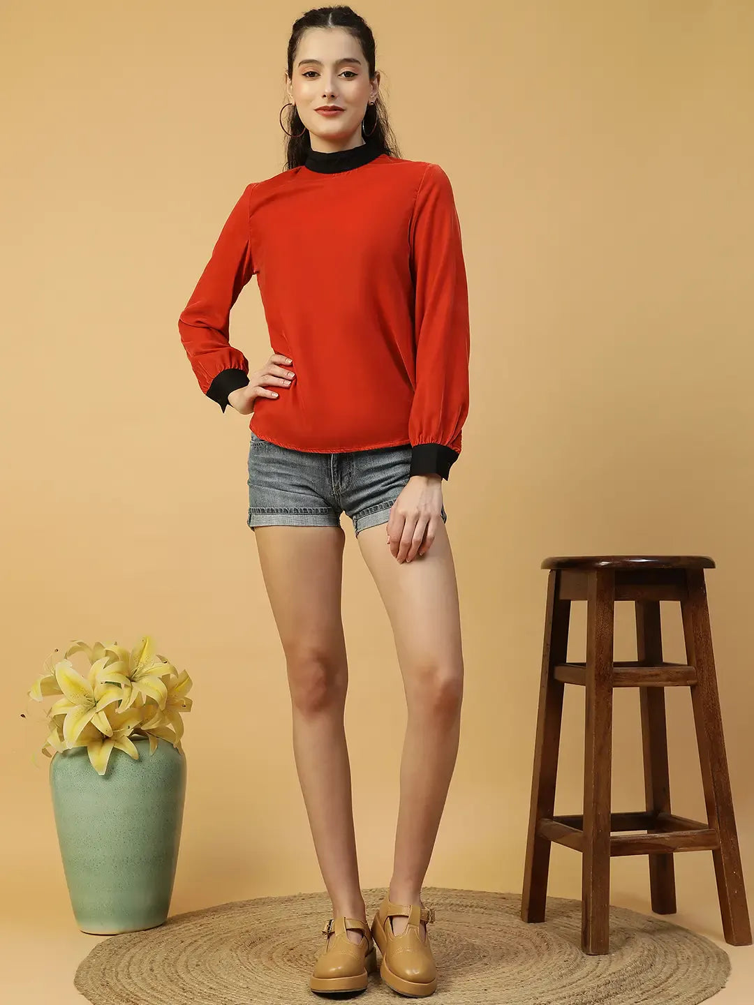 Elevate your evening wardrobe with the Delighted Red Velvet Long Sleeve Women’s Top, crafted from smooth, plush velvet for a luxurious feel and stylish appearance. This women’s velvet top features a rich red hue, a flattering round neck, and long sleeves, offering a chic, elegant silhouette. Its regular fit and waist-length curved hem make it versatile for pairing with skirts, trousers, or jeans. Perfect for dinner parties, night outs, festive events, casual gatherings, and evening wear, this red velvet top for women combines sophistication, comfort, and effortless style, making it a must-have statement piece in your wardrobe.