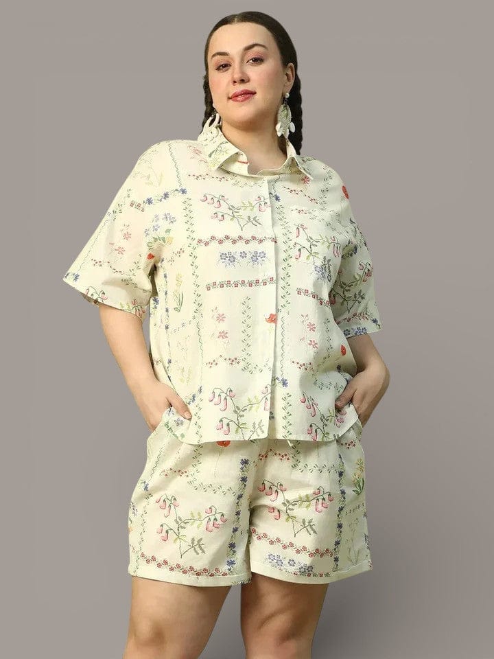 Shine in style with this effortlessly chic Sandy Breeze Beige Printed Shirt & Shorts Plus Size Cotton Co-ord Set. Featuring a collared, short-sleeve shirt with a button placket and a handy chest pocket, this co-ord set blends comfort with casual elegance. The matching elasticated shorts, designed with an adjustable tie-knot string, offer a customizable fit for all-day ease. Made from soft, breathable cotton, it’s perfect for everything from laid-back brunches to cozy lounging. Dress it up with sneakers or sandals and own your style with confidence