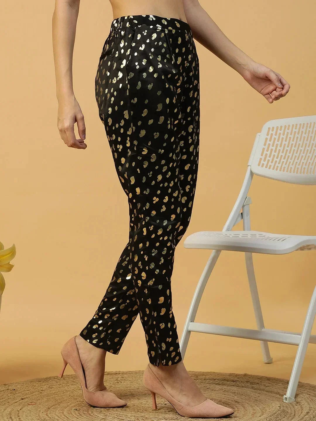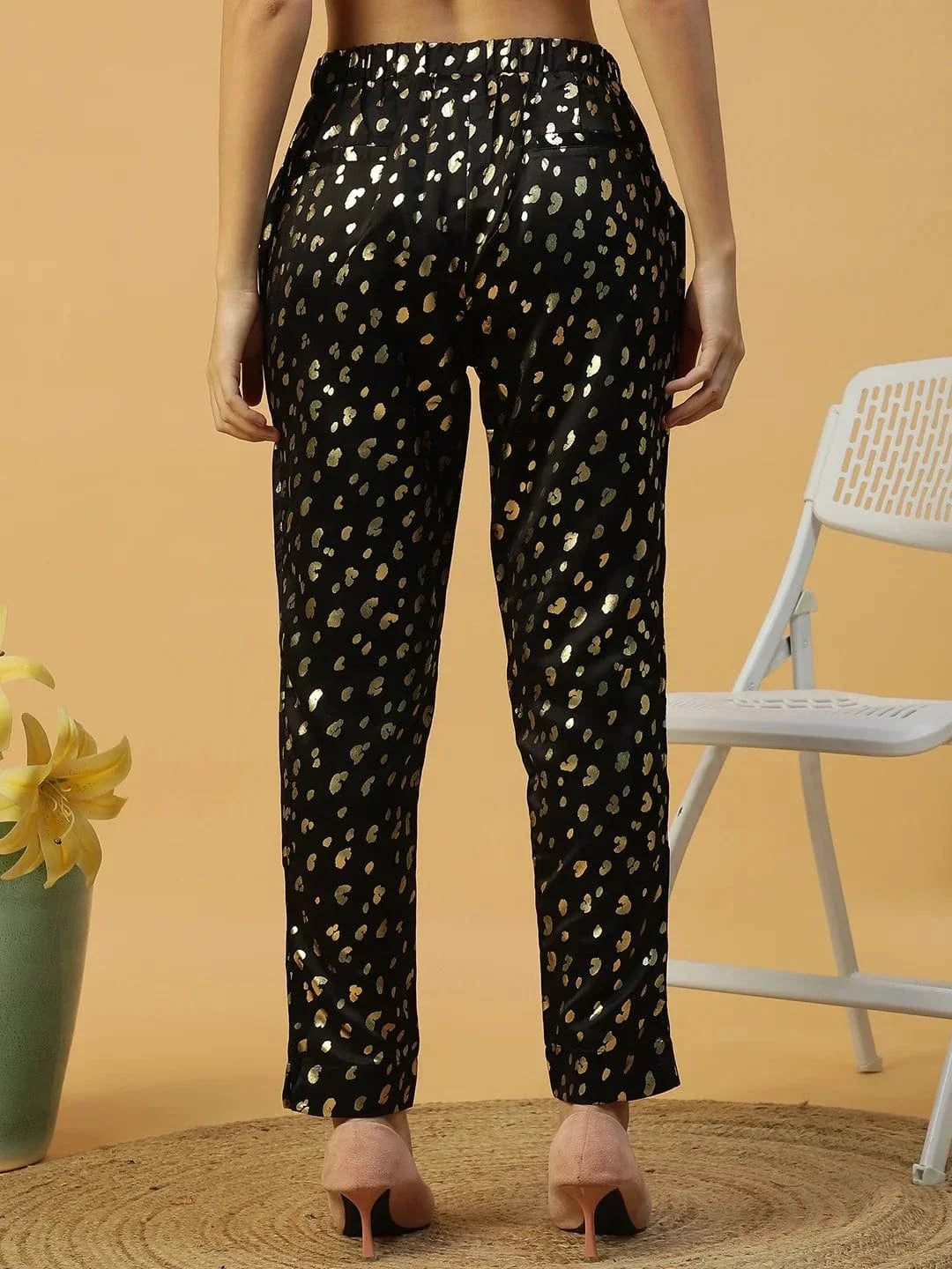 Add a touch of glamour to your everyday look with the Sanguine Black Foil Print Elasticated Women's Pant. These pants are designed for comfort and style, featuring a sleek foil print that catches the light beautifully. The elasticated waistband ensures a relaxed fit, while the side pockets offer practicality. Perfect for casual outings or lounging in style, these pants are a must-have addition to your wardrobe. Pair them with a fitted top or crop top for a chic, effortless vibe.