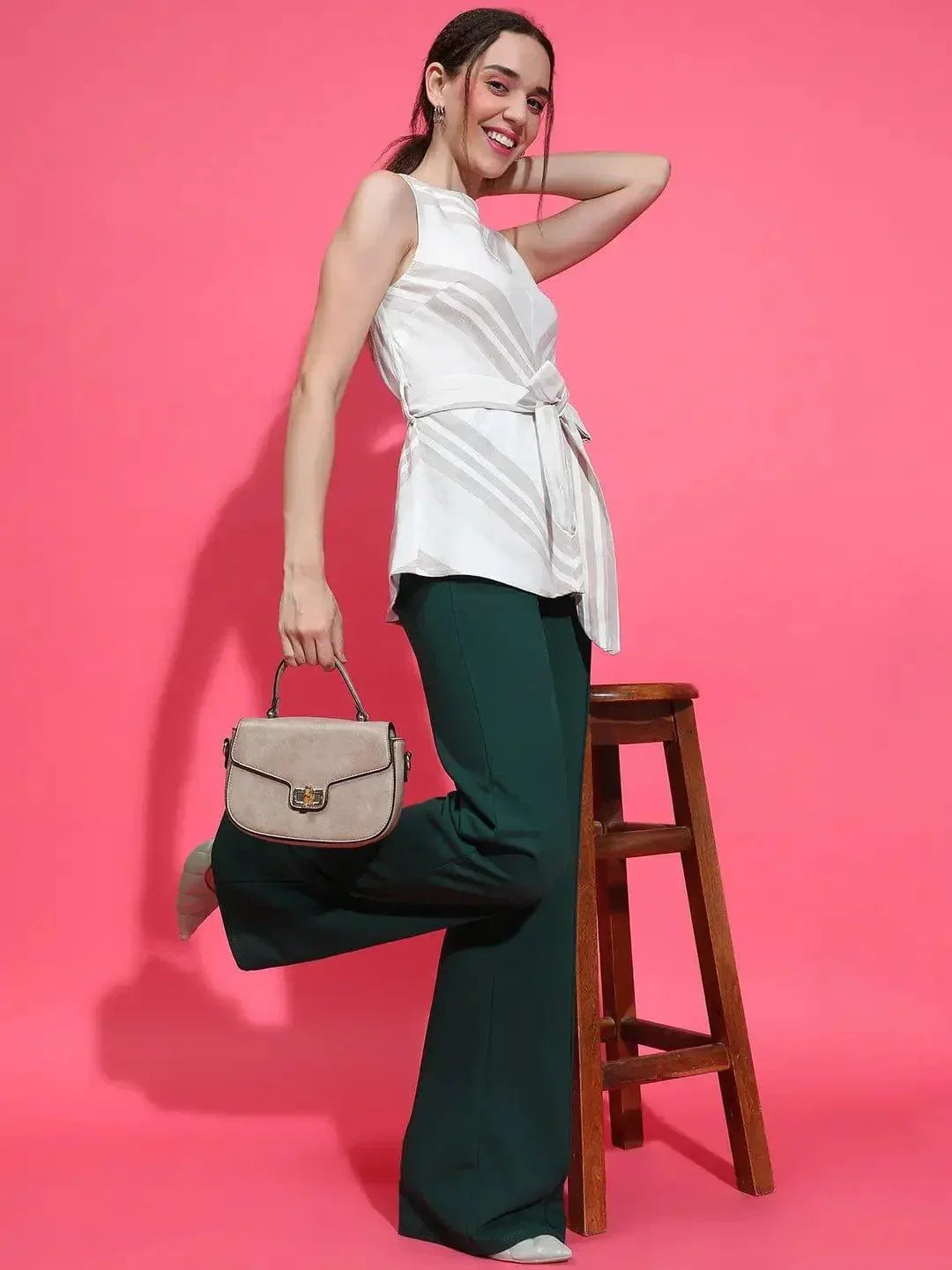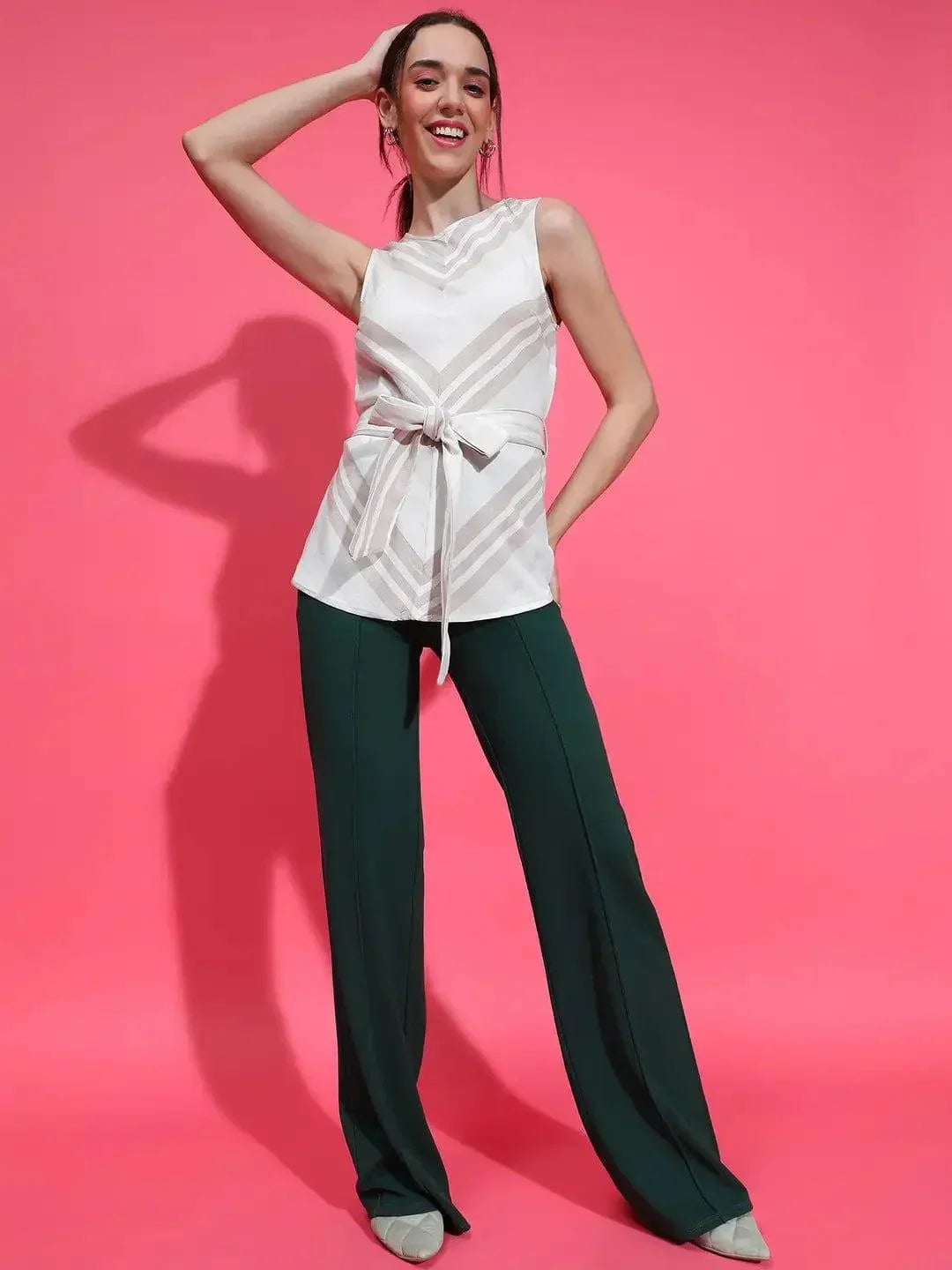 Look fabulous flattering with our Sizzling Grey Stripe Print Sleeveless With Waist Belt Peplum Top , designed to elevate your style game effortlessly. Crafted from high-quality polyester, this top offers both comfort and durability, ensuring you look and feel your best all day long. With its flattering round neckline and eye-catching stripe print, this top exudes timeless charm with a modern twist. The peplum silhouette adds a touch of femininity, while the waist tie-knot belt accentuates your figure for a flattering fit. Whether you re heading to the office or meeting friends for brunch, this versatile top pairs beautifully with tailored trousers or jeans for a polished yet relaxed look. Embrace the epitome of style and confidence with this stripe print peplum top, perfect for any occasion.