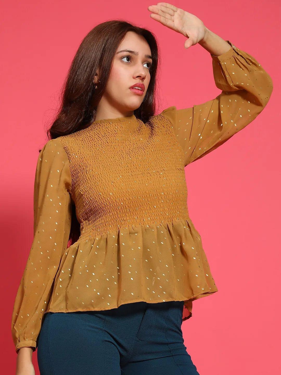 Carry the best look with this Magic Mustard Long Sleeve Smocked Women's Peplum Top. Featuring a round neck and long sleeves, the top boasts a beautiful smocked design that adds texture and detail. The foil print creates a subtle, eye-catching shimmer, perfect for both casual and special occasions. Made from high-quality polyester with a comfortable lining underneath, it ensures a perfect fit and comfort. The peplum hem adds a touch of elegance, making this top a versatile piece that pairs effortlessly with jeans, skirts, or trousers. Ideal for adding a chic, polished look to your wardrobe.