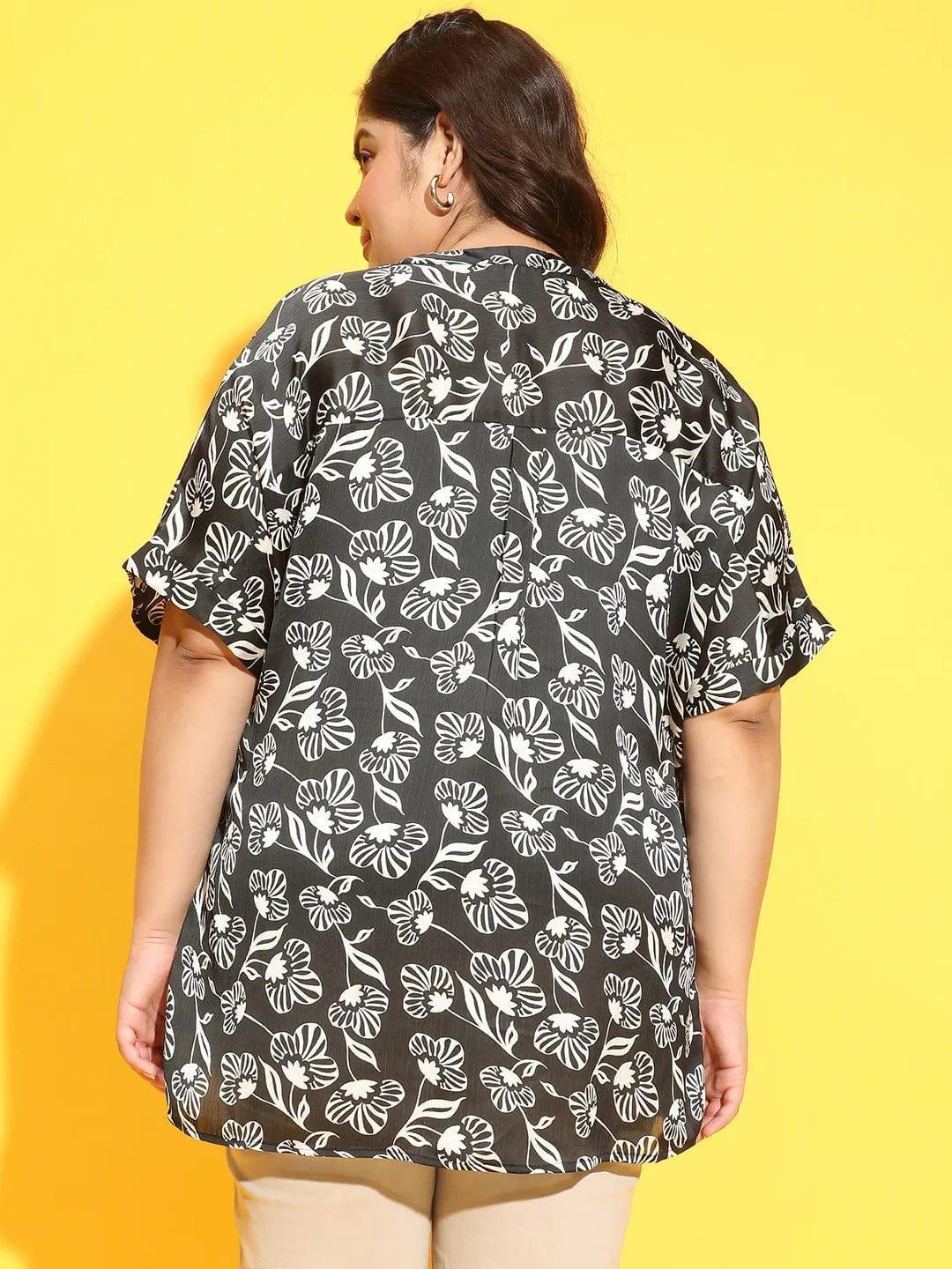The Stellar Black Floral Print with Band Collar and Chest Pocket Plus Size Women Top, a trendy addition to your wardrobe. Made from polyester, it features a chic floral print, band collar, and short sleeves. With a waist-length cut and two front chest pockets, it's both stylish and functional. Pair it with skirts, shoes, or trousers for a fashionable look that suits any occasion.