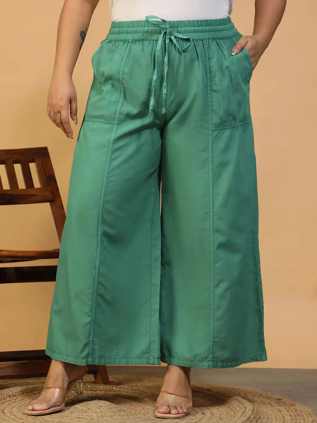 Step into calm and effortless style with pant that love your curves as much as you do. These Twirlpop Green Elasticated With Tie-Up Detail Plus Size Women Long Cotton Pant are designed for comfort, movement, and confidence. The soothing green shade adds a versatile, chic touch, while the elasticated waist with adjustable tie-up detail ensures a personalized, curve-friendly fit. The long, flared silhouette creates graceful movement, giving an elegant yet relaxed vibe, perfect for casual outings, brunch dates, or cozy weekends. Side pockets add practicality without compromising style, and the soft, breathable cotton fabric ensures all-day comfort. Effortless to style and easy to wear, these pants are a must-have for plus-size women who want functionality, comfort, and flare all in one.