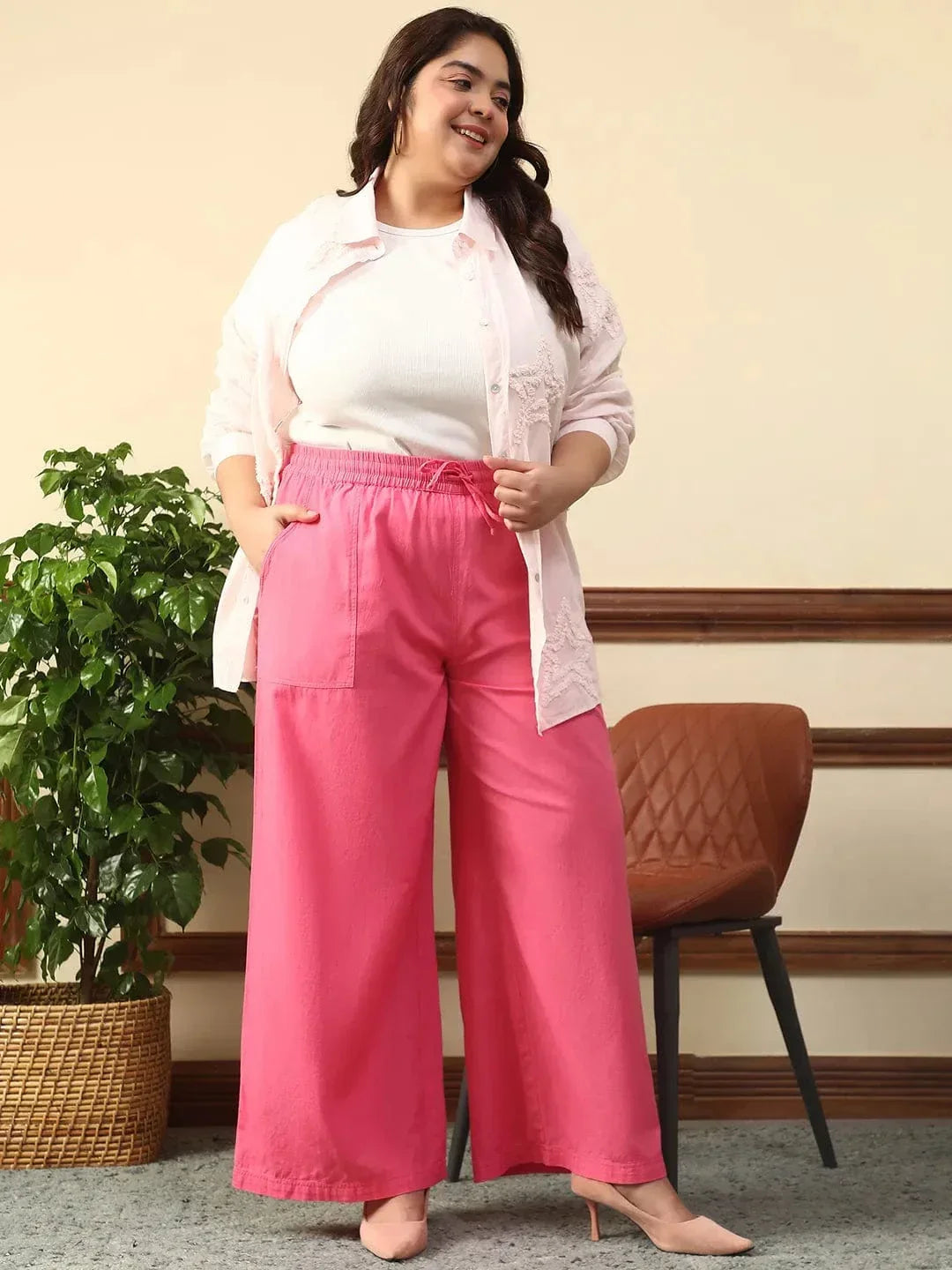 Add A Playful Pop Of Femininity To Your Wardrobe With Our Vibey Pink Elasticated With Tie -Up Detail Plus Size Women Cotton Linen Flare Pant – Where Comfort Meets Effortless Style. Designed In A Soft, Breathable Cotton-Linen Fabric, These Pants Are Tailored To Flatter Fuller Figures With A Roomy, Flowy Silhouette And An Elasticated Waistband With A Cute Tie-Up Detail For A Personalized Fit. The Flared Hemline Adds A Touch Of Drama And Movement, While The Side Pockets Make It Functional Without Compromising On Style. The Pastel Pink Hue Is Soothing, Fresh, And Perfect For Sunny Days Or Laid-Back Evenings – Making This An Everyday Staple With Standout Flair.