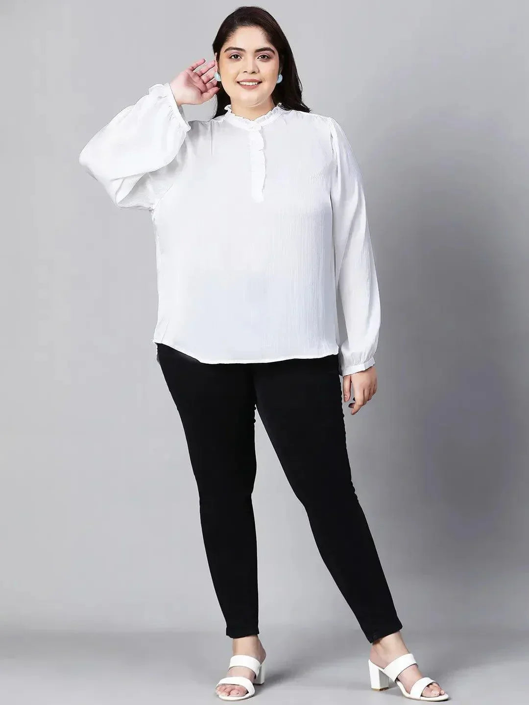 A white buttoned plus-size women's top is a perfect blend of comfort and style that caters to your fashion needs. This top features a classic round neck design and long sleeves, ensuring both elegance and comfort. The placket of buttons adds a touch of sophistication to the overall look. Crafted with premium quality polyester fabric, ensuring a soft and breathable experience for every wear. Elevate your style with the timeless charm of wearing this one.