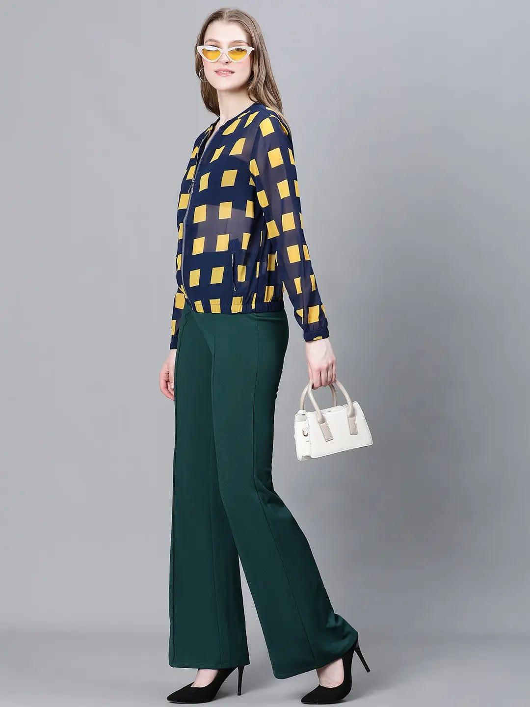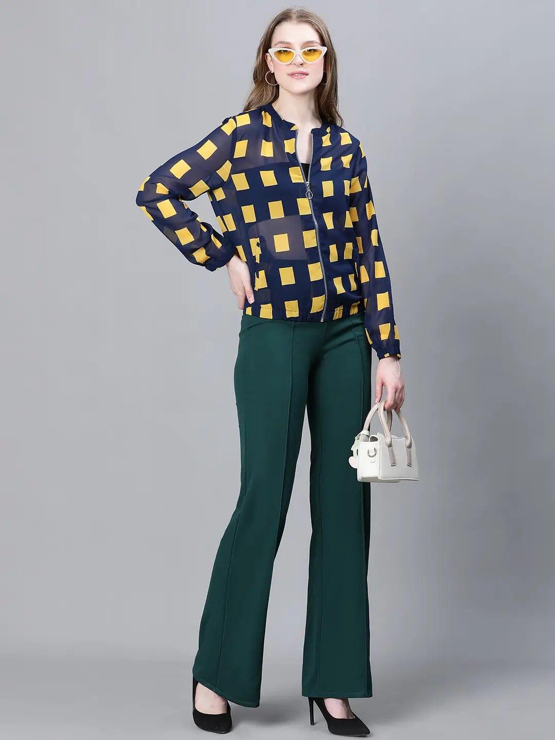 Meld in all trends with this Blue check jacket bomber from oxolloxo. It is the coolest pick of the season. Made with Polyester lining, it features an all-over abstract print, long sleeves, pockets, and a zip. This jacket is ideal for casual occasions, giving you a modern appearance.