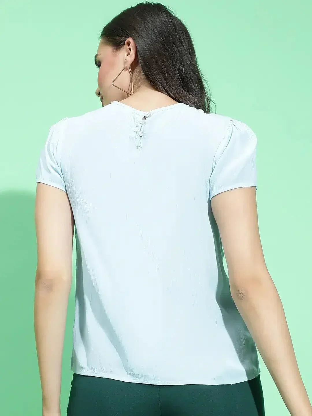 Introducing the Bangzy Light Green short sleeve Women crepe top, a perfect blend of elegance and modern style. Crafted from premium viscose fabric, this top ensures an exceptional fit, offering unmatched comfort and a chic look. Featuring a sophisticated round neckline, trendy short sleeves, a flattering round hem, and a versatile waist-length design, this top is a wardrobe essential. Its magical versatility makes it ideal for any occasion, from the office to casual outings to parties. Pair it with cool trousers from our trouser section to complete your look. Embrace high-tide style greatness and elevate your look this season with this stunning piece.