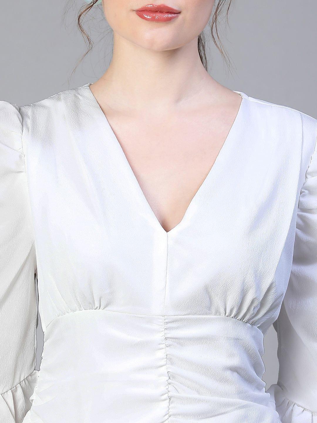 This dress is the quintessential party dress for ladies who seek a blend of classic and contemporary fashion. The short puff sleeves add playful volume contrasting the fitted silhouette. The solid pattern ensures the look remains simple yet fashionable. Its above-knee length suits both day and night occasions. For women needing a party dress that offers charm and practicality, this white women dress excels perfectly.