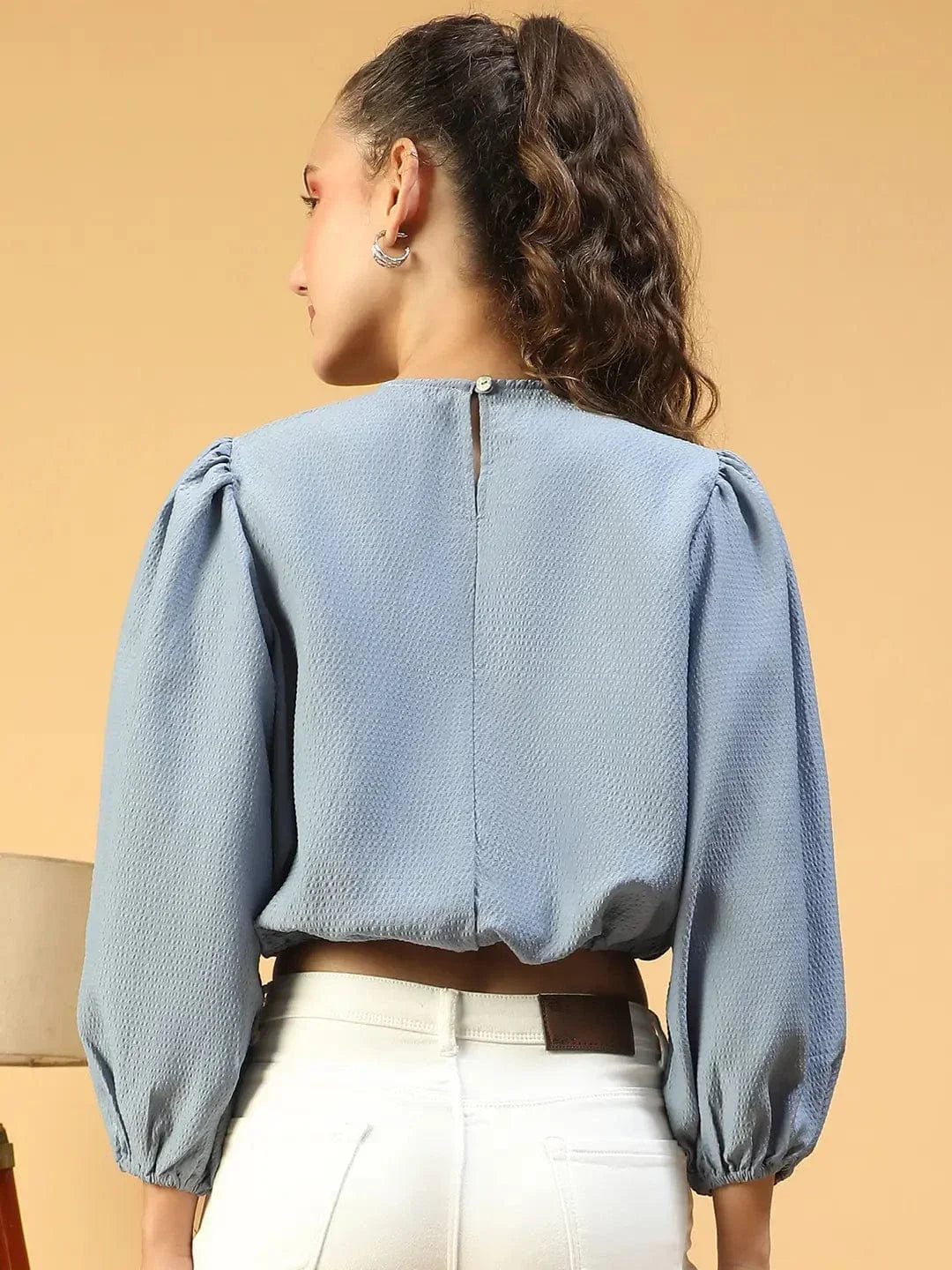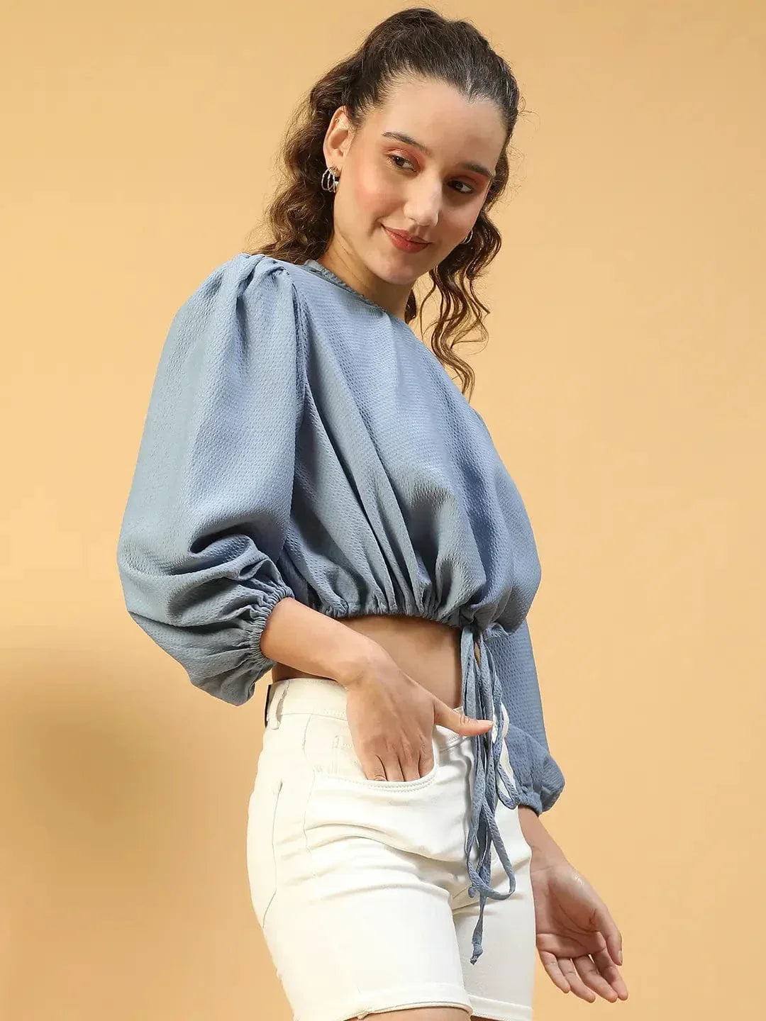 Embrace effortless style with this Swish Solid Blue Long Sleeve Elasticated Tie-Up Detail Women Crop Top. Featuring a classic round neck, long sleeves, an elasticated waist for a comfortable fit and tie-up detail adding a trendy touch, allowing you to adjust the fit to your liking. Made from soft polyester, it offers breathability and ease of wear, making it perfect for casual outings or relaxed events. Pair it with jeans, skirts, or shorts for a versatile look that combines comfort and style.