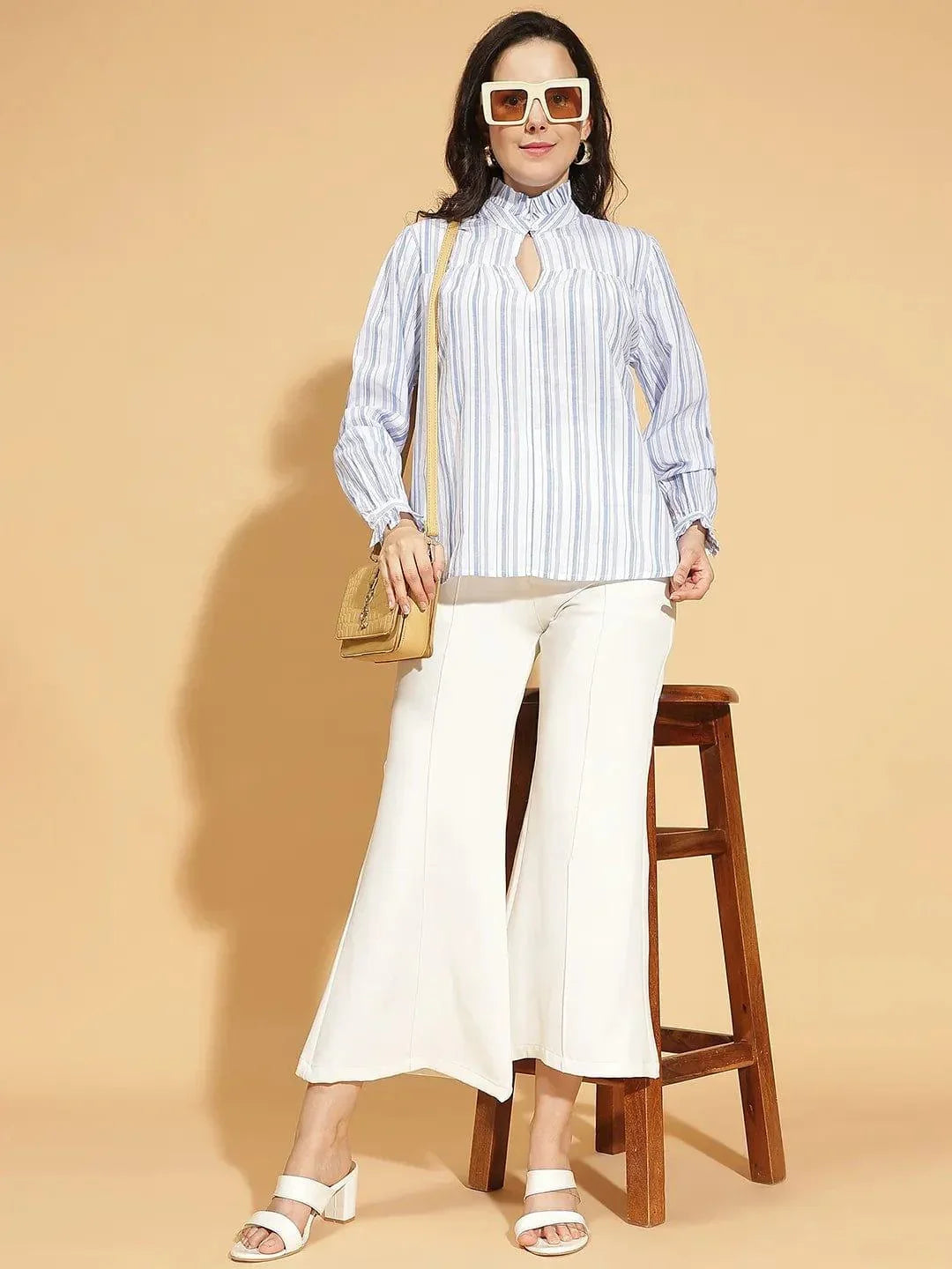 Social Blue Stripe Print Long Sleeve Women Cotton top features a chic high neck design with the blue stripe print, offering a timeless chic look. The long sleeves provide warmth and coverage, making it perfect for layering or wearing on its own. The button closure at the front adds a subtle detail that enhances the overall design. Crafted from soft, breathable cotton, this top ensures comfort and a flattering fit throughout the day. Ideal for both professional and casual settings, it pairs effortlessly with trousers, skirts, or jeans for a look that is both polished and comfortable.