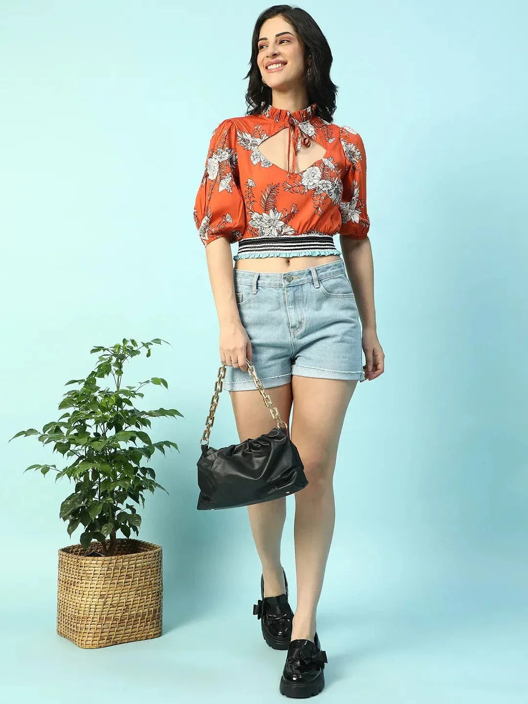 Channel Boho-Chic With A Floral Twist In This Rage Rust Floral Print Keyhole Neck Smocking Detail Women Crop Top. Designed In Soft Polyester, It Boasts An Eye-Catching Floral Print, Keyhole Neck With Tie-Up String, And Smocking Detail That Hugs Your Curves Beautifully. With Breezy Short Sleeves, It’S The Ultimate Pick For Brunches, Getaways, Or A Casual Day Out. Just Add Flared Jeans Or A Flowy Skirt To Complete The Look.
