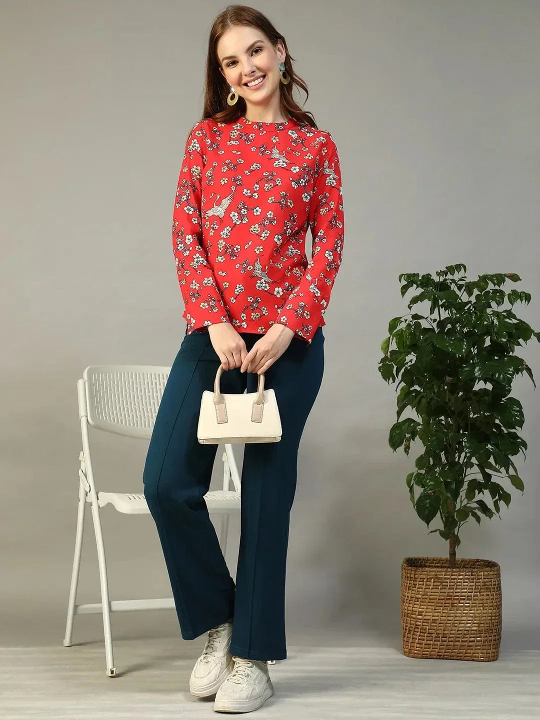 Bright, Bold, And Beautiful, This Rose Red Floral Print Round Neck Long Sleeve Women Top Is Your Shortcut To Instant Style. Crafted In Lightweight, Easy-Care Polyester, It’s Designed To Keep You Comfy While Turning Heads.
