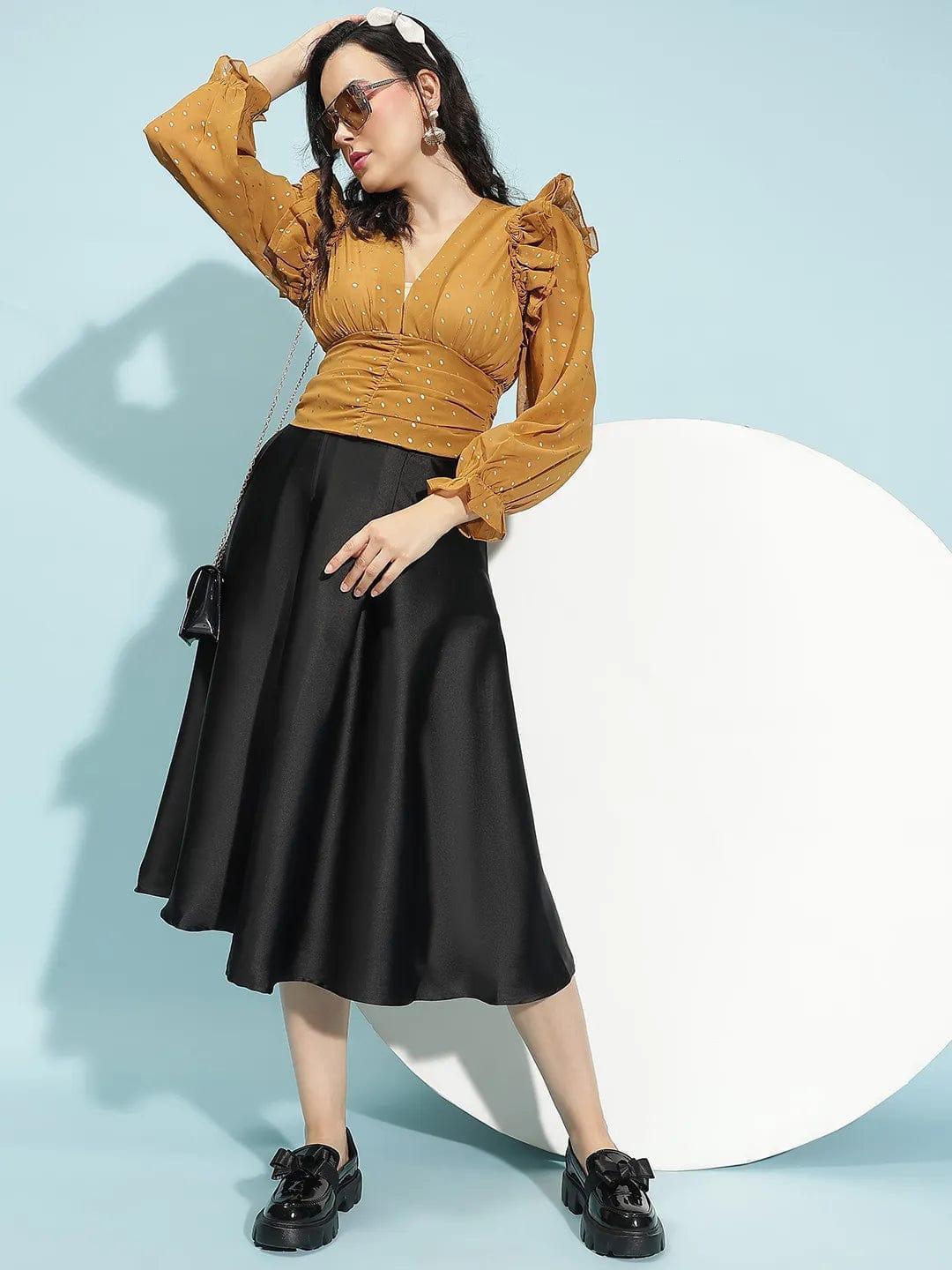 Shine in the latest trend with this BMustard Long Sleeve Ruffle Detail Women Crop Top. Featuring a V-neckline and long sleeves, it showcases beautiful ruffle details and gathered pleats that create a flaunty look. The foil print adds a subtle shimmer, making it perfect for both casual and special occasions. Made from high-quality polyester, this top combines style with comfort and durability. Its cropped design pairs effortlessly with high-waisted skirts or pants, offering a chic and versatile addition to any outfit.