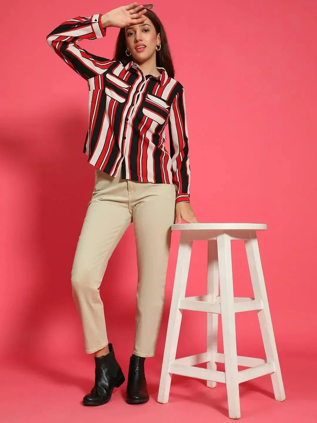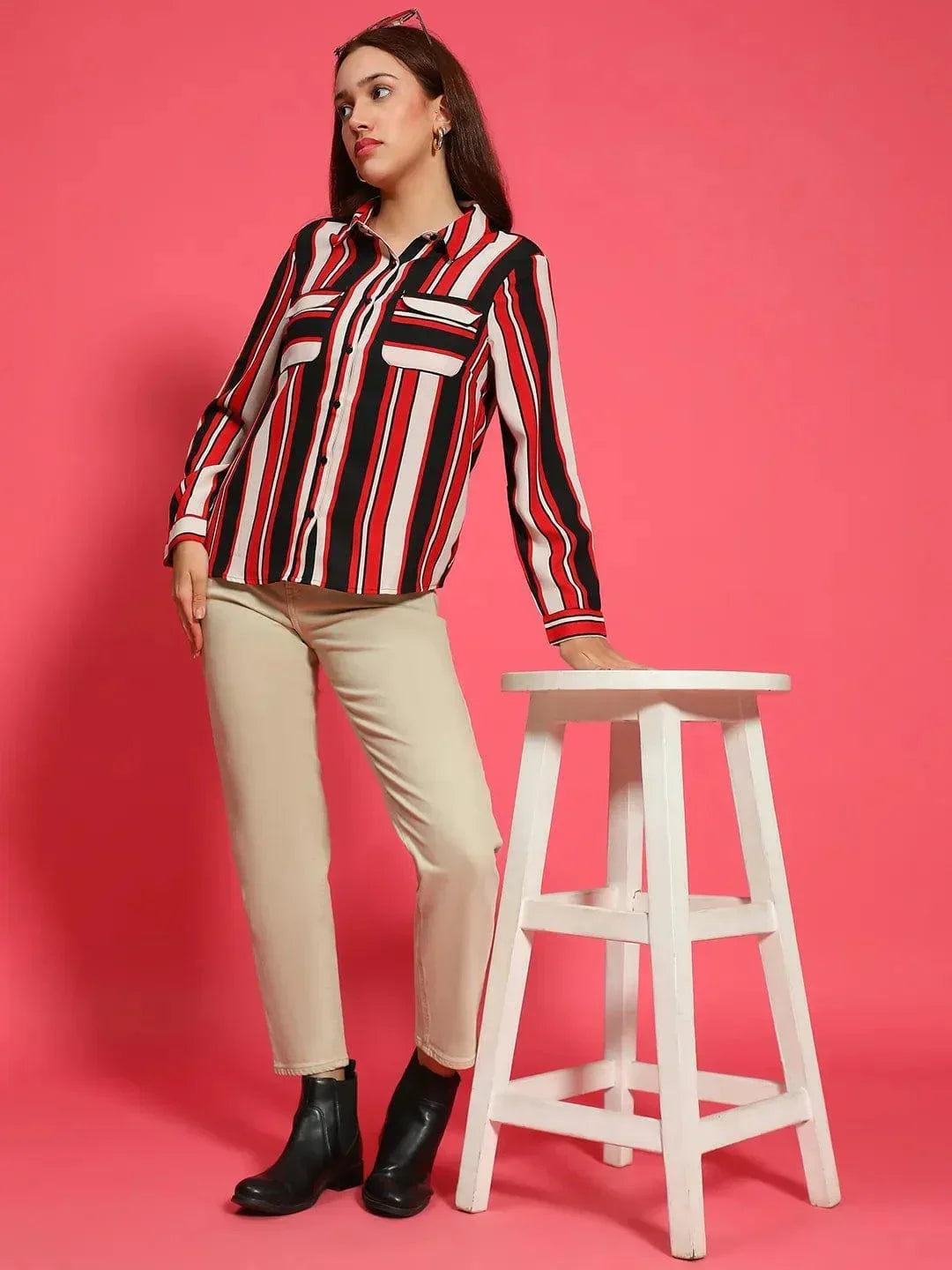 Elevate your everyday style with this Women Stripe Print Long Sleeve Collared Multicolor Top With Pockets , featuring a bold stripe print that adds a touch of modern flair. The long sleeves and collared design give it a polished, classic look, while the addition of chest pockets enhances its practicality. Made from high-quality polyester, this top combines comfort with durability, ensuring it maintains its vibrant colors and shape. Perfect for both casual and semi-formal occasions, this versatile top pairs effortlessly with jeans or skirts, making it a stylish and functional addition to your wardrobe.