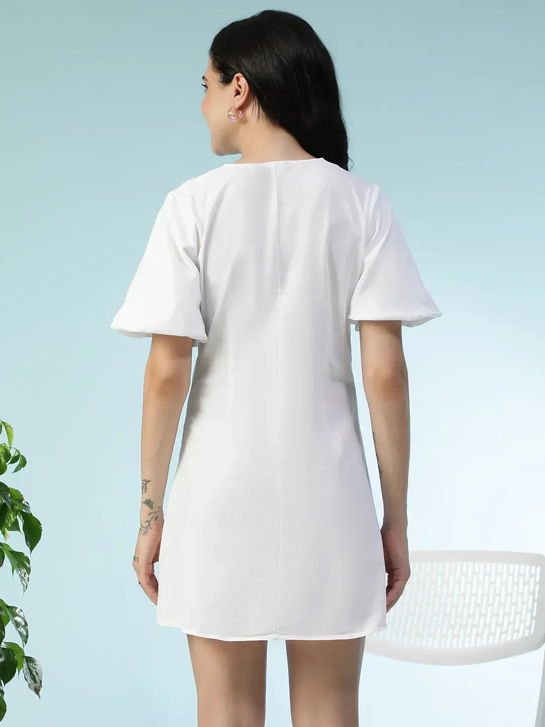 Featuring a flattering V-neckline, short sleeves, and a clean button-down front, it strikes the perfect balance between structure and ease. The above-knee length and regular fit create a breezy silhouette ideal for warm days. Finished in a crisp solid white hue, this versatile dress transitions seamlessly from brunch dates and beach outings to everyday casual wear.