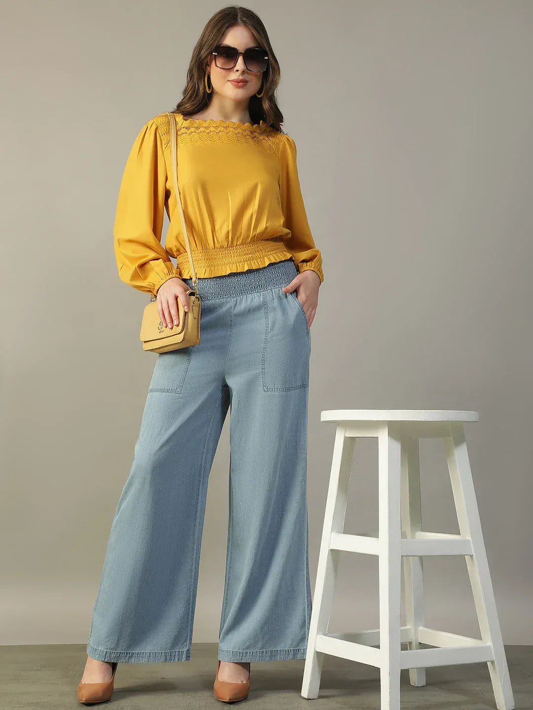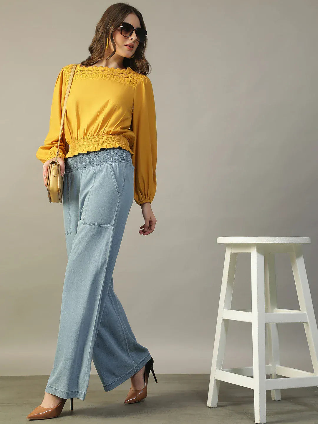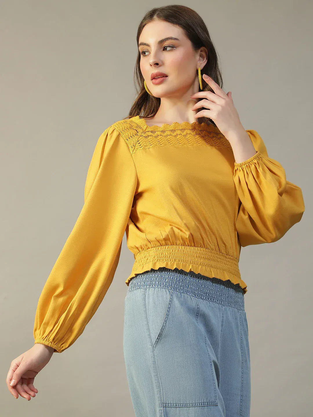 Bring a fresh update to your closet with this chic YELLOW top for women. The soft VISCOSE fabric feels lightweight, while the Regular Fit fit ensures a flattering finish. Square neck neckline and long sleeve sleeves enhance the design, making it perfect for casual. A versatile topwear pick for casual outings, office looks, and stylish weekend plans.