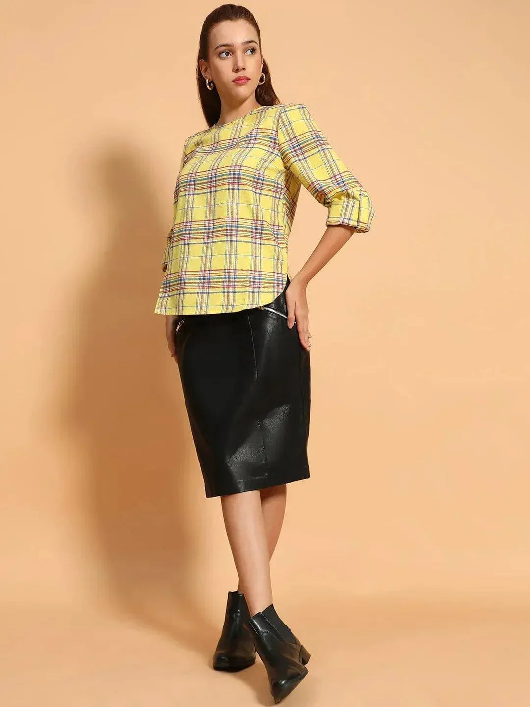 Happy Yellow Round Neck Long Roll Up Sleeve Brush Check Cotton Women Top is designed with a round neckline and long sleeves that can be rolled up for a more relaxed look and the vibrant brush check pattern giving trendy appeal and breathable cotton ensures all-day comfort whether you’re running errands or meeting friends. Pair it with tailored trousers for a smart-casual look or with denim for a laid-back, effortless ensemble. This top is a perfect blend of style and function, making it a versatile addition to any wardrobe. Pair it with shorts, pants or jeans and look super nice with all newness.
