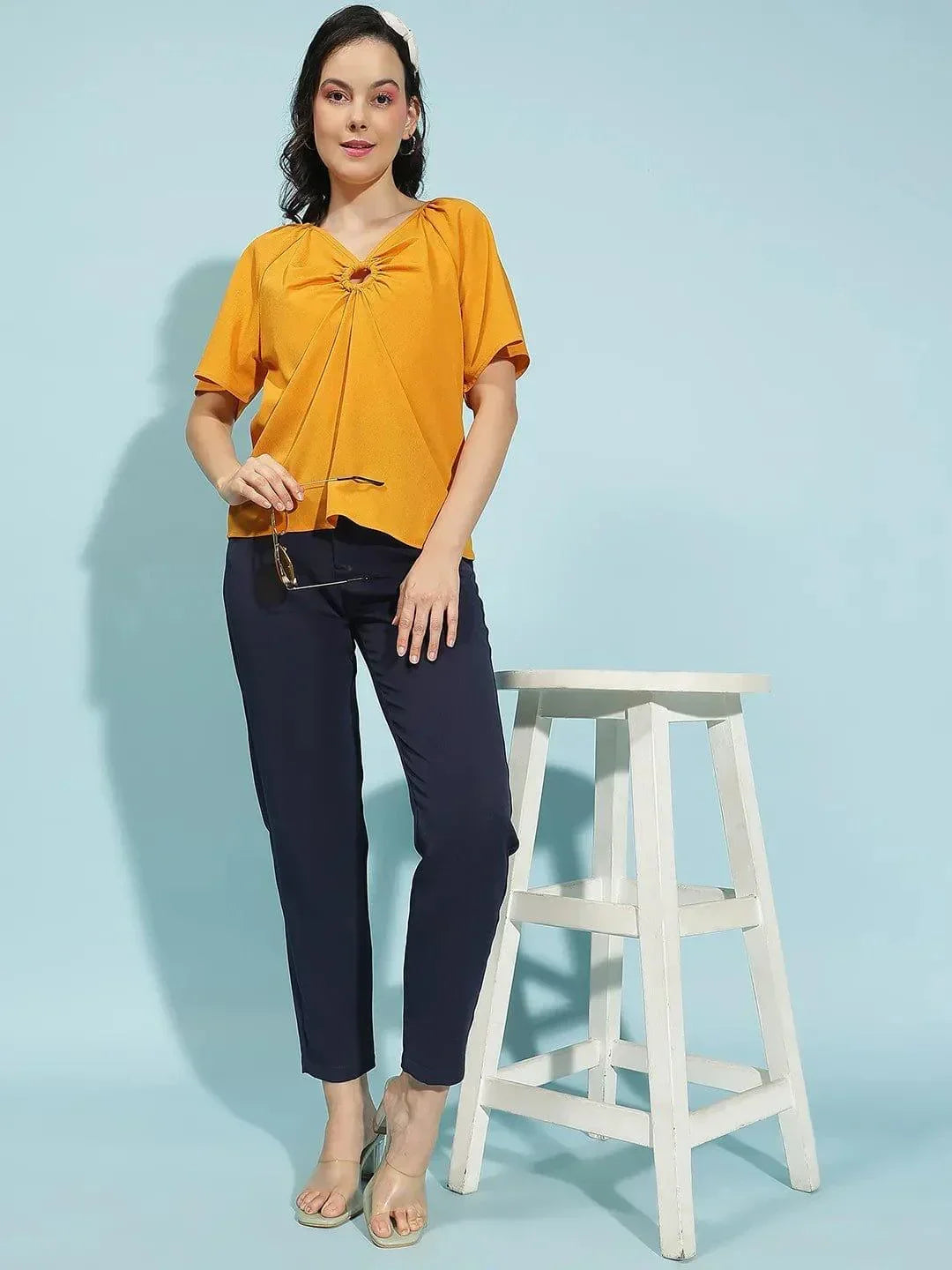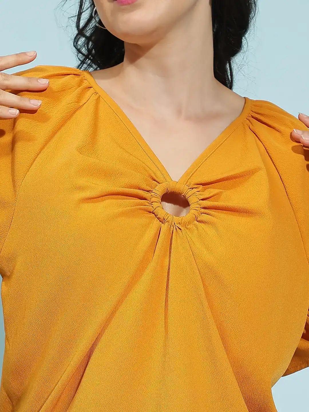 Just be the glam diva, wearing thisBright Yellow Short Sleeve Hoop Detail Women Top, designed to make a statement with every wear. The standout hoop detail just below the V-neckline creates a bold, eye-catching focal point, while the short sleeves add a casual touch. Crafted from premium polyester fabric, this top offers a luxurious, lightweight feel and effortless drape, ensuring comfort from day to night. Whether you?re powering through the workday in tailored trousers or keeping it cool in jeans for a laid-back evening, this top is your must have of the season.